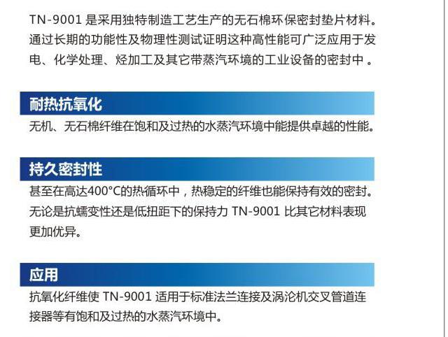 TN-9001是采用獨(dú)特制造工藝生產(chǎn)的無石棉環(huán)保密封墊片材料,通過長(zhǎng)期的功能性與物理性測(cè)試證明這種高性能可廣泛應(yīng)用于發(fā)電、化學(xué)處理、烴加工及其它蒸汽環(huán)境的工業(yè)設(shè)備的密封中。
